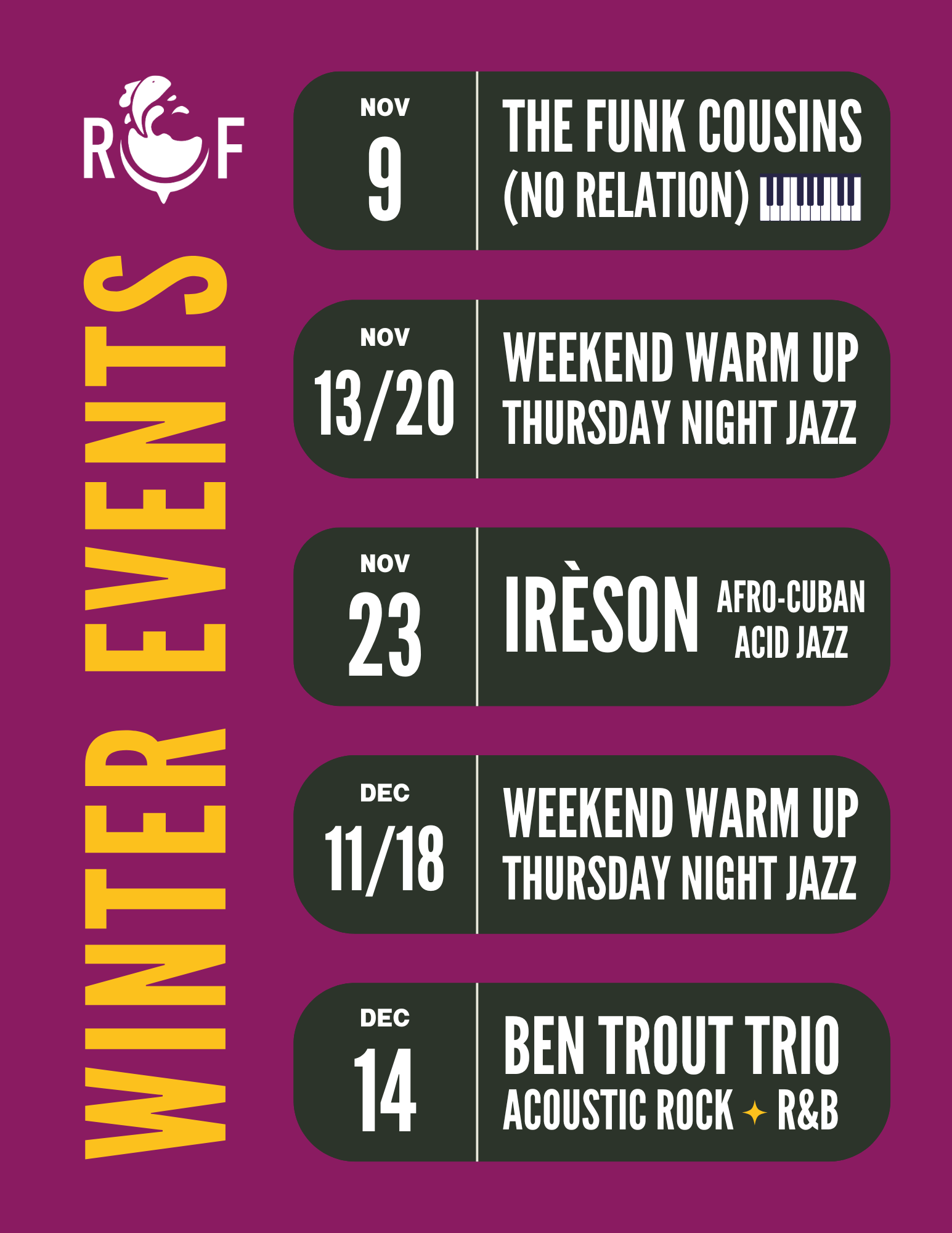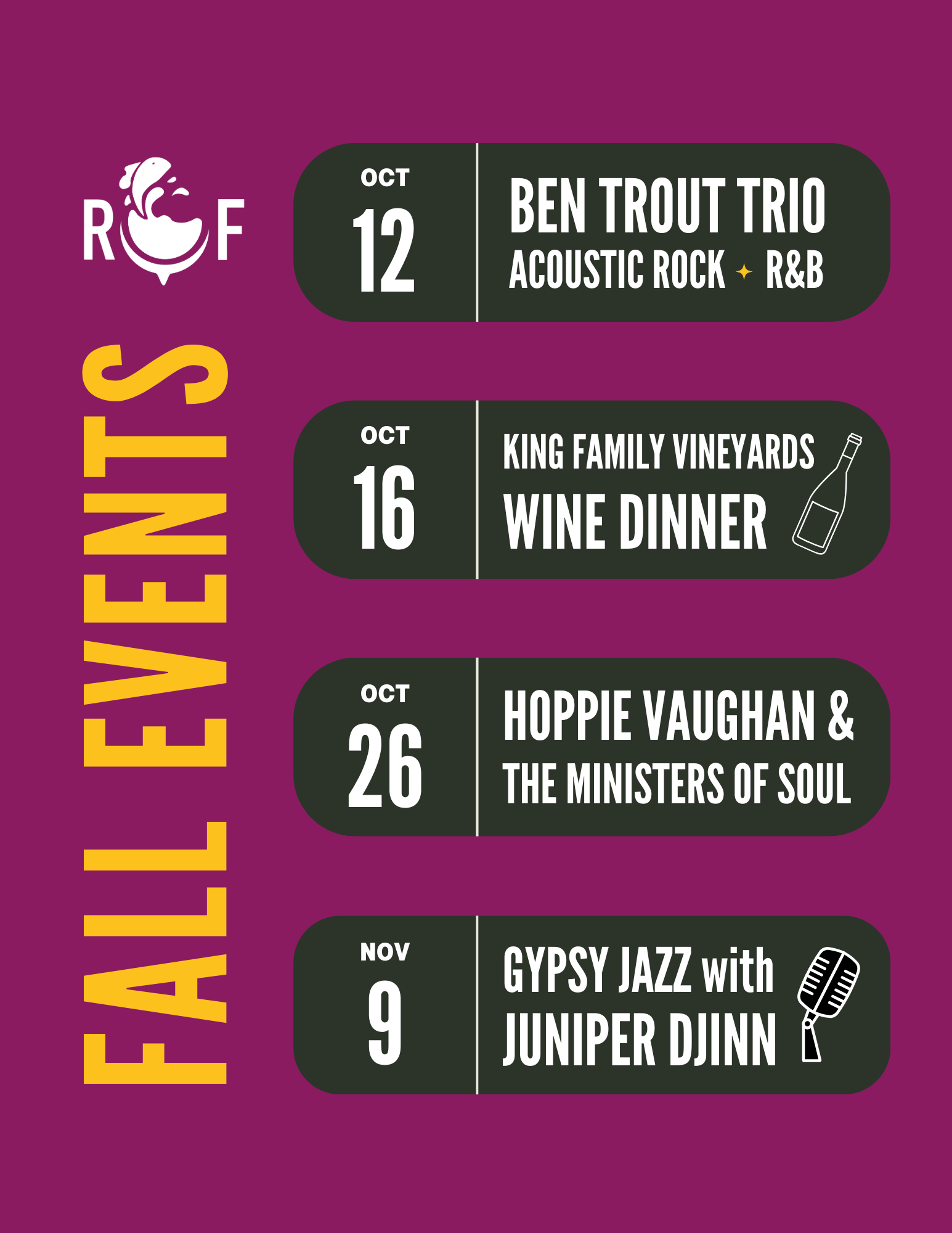 Join us for live music on the second and fourth Sunday each month. We offer an array of local favorites as a compliment to your dining experience. You may even decide to kick off your shoes and dance!